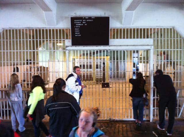 Tocamos tierra en la isla, información en español para los hispanos y audio guía también dentro del precio de la visita (30$), mientras caminamos hacia la entrada de la prisión, pasamos por la oficina de los guardias forestales, la torre del guardia, el cuartel de la guardia y la entrada fortificada, el taller de reparaciones eléctricas, la capilla militar hasta la entrada donde comienza la visita a la prisión.