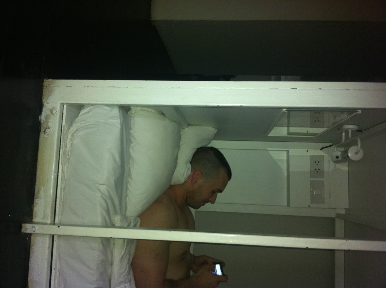 Antes de acostarnos os dejo una fotico mas de Mike poniendo el móvil en solfa a punto de descansar…para que veáis que en cada litera tienes tu espejo, enchufes para cargar el móvil y luz para leer.